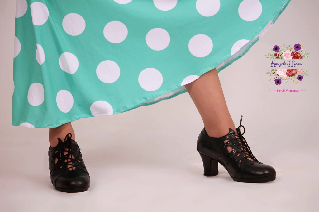 Apresentamos a saia que vai transformar suas aulas e apresentações de flamenco: uma peça clássica e irresistível, verde água com grandes bolinhas brancas. , criando um visual elegante e cheio de personalidade.